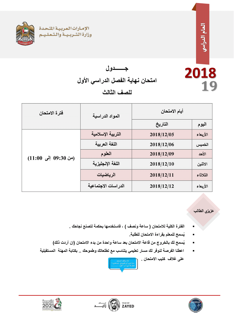 جدول اختبارات نهاية الفصل الدراسي الأول للعام الدراسي 2019 2020